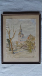 Akvarel, Valdemar Møller, b: 23 h: 31, Kirkemotiv, signeret med monogram af skuespiller og tegner Valdemar Møller. Bag glas i ramme, rammemål 31 x 39. Gerne besked med sms, evt. forsendelse + porto.