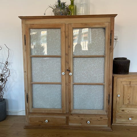 Det nederste glas er desværre revnet og skal skiftes. Møblet er antik og tungt.