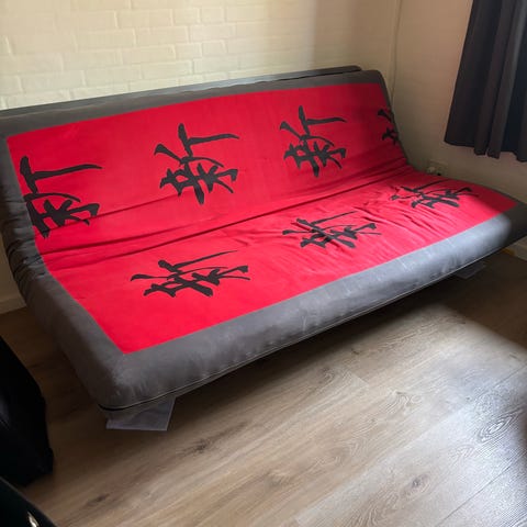 Ca. 10 år gammel. God stand, kun brugt som gæsteseng. Betræk kan tages af. Mål: B 225 cm, D 105 cm. Udslået mål: B 225 cm, D ca. 238 cm. Madrasmål 165x200. Er ret tung, det kræver mindst 2 par stærke arme at flytte den.