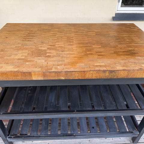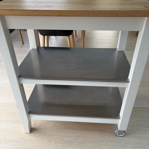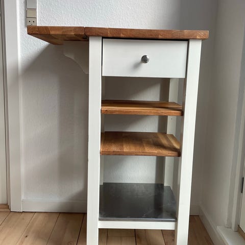 IKEA Vadholma køkkenø med massiv træbordplade og sort stel. Modellen har én skuffe under bordpladen samt to åbne hylder med lameller til opbevaring. Køkkenøen er egnet som ekstra arbejdsplads i køkkenet og giver plads til opbevaring af køkkenredskaber, service eller andre køkkenartikler. Stellet er i sortlakeret materiale, mens bordpladen er i træ med stavmønster.