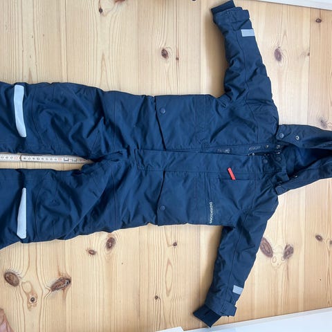 Didriksons flyverdragt i blå til børn, unisex, str. 140. Materiale i polyester. Dragten har hætte, gennemgående lynlås foran og elastik i taljen bagpå. Refleksdetaljer på benet. Ifølge mærket er flyverdragten 100 % vandtæt. Der ses slitage/skrammer i stoffet enkelte steder, som vist på billederne.
