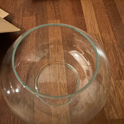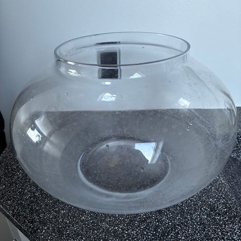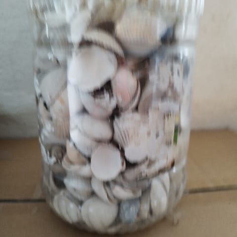 Dekorationsskål med blandede strandskaller i glas. Skålen er fyldt med forskellige naturfarvede skaller i varierende størrelser og former. Egnet som dekoration i vindueskarm, på hylde eller bord i hjemmet.