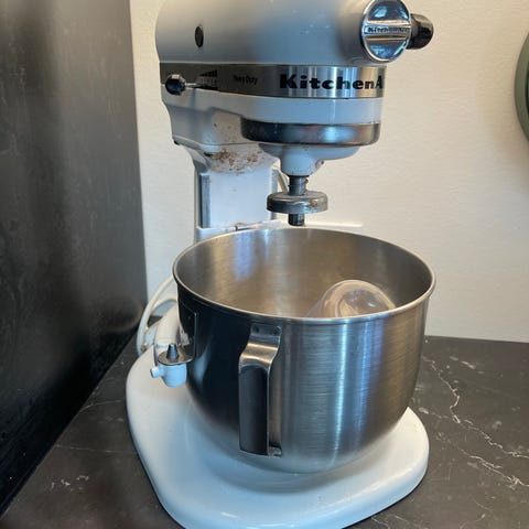 Kitchen Aid Artisan røremaskine, som kan hjælpe dig til alt det gode bagværk. De nødvendige røre- piske- og ælteredskaber medfølger samt et "låg" til at undgå melstænk. Røreskålen er af rustfrit stål. Se også mine annoncer med pasta-udstyr og kødhakker til maskinen.