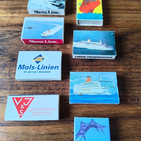 Samling af blandede tændstikæsker i spand. Tændstikæskerne har forskellige motiver og tryk og fremstår som en blandet pakke. Velegnet til samlere af tændstikæsker eller som dekoration og rekvisit. Antal, alder og oprindelse på æskerne er ikke specificeret.