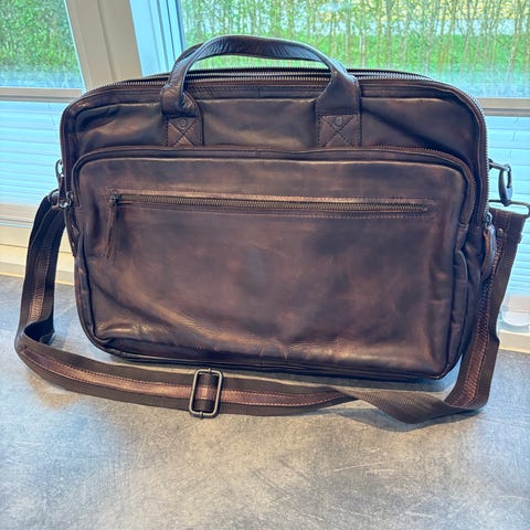 Saddler læder taske i sort til unisex. Tasken har to bærehanke og aftagelig skulderrem. Udvendigt findes en frontlomme med spænde og en rem på bagsiden, der kan bruges til fastgørelse på kuffertstang. Indvendigt er der lynlåslukning, foret rum samt mindre lynlåslomme til opbevaring af mindre genstande. Egnet til daglig brug, arbejde eller studie, hvor der er behov for en rummelig lædertaske.