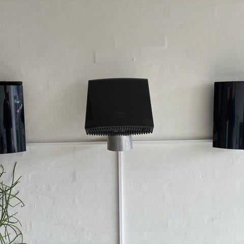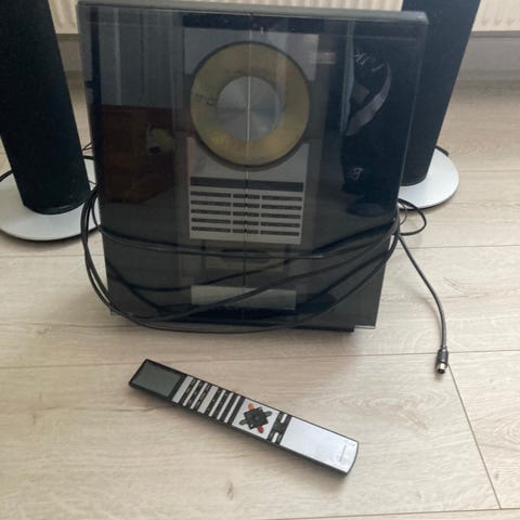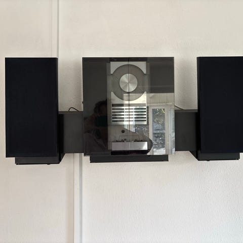 Bang & Olufsen stereopakke. Pakken omfatter et vægmonteret anlæg med CD-afspiller og front i glas samt tilhørende fritstående højttalere på gulvstandere. Systemet er egnet til afspilning af CD’er og radiolytning, afhængigt af den konkrete model og tilslutningsmuligheder. Designet er kompakt og lodret monteret for at spare plads og passe ind i en stue eller et lytterum. Yderligere tekniske specifikationer kan afhænge af den præcise modelbetegnelse.