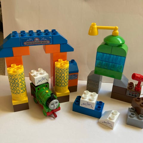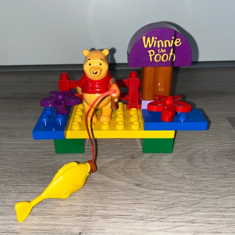 DUPLO Disney 5947 med Peter Plys hus. Medfølgende figurer og dele omfatter blandt andet Peter Plys, Æsel, møbler samt tilbehør som honningkrukke og skilt med “Winnie the Pooh”.