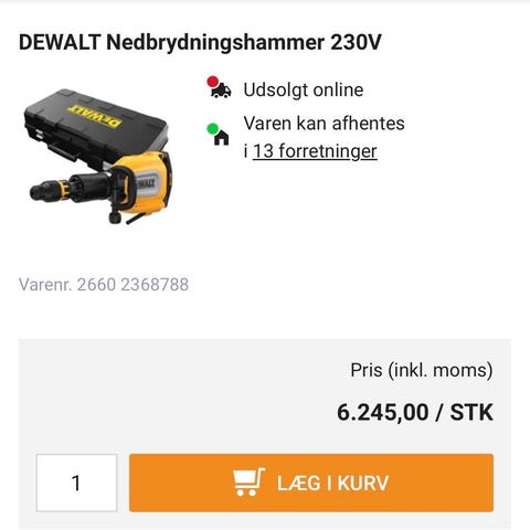 DeWalt D25981K-QS nedbrydningshammer 230V 2100W. Nedbrydningshammeren drives af 230 V og har en effekt på 2100 W. Den maksimale slagtal er 960 slag pr. minut, og slagkraften er 62 J. Vægten er 31 kg. Modellen leveres med mejsel og er egnet til krævende nedbrydningsopgaver i beton og murværk, hvor der er behov for høj slagkraft og kontinuerligt arbejde.