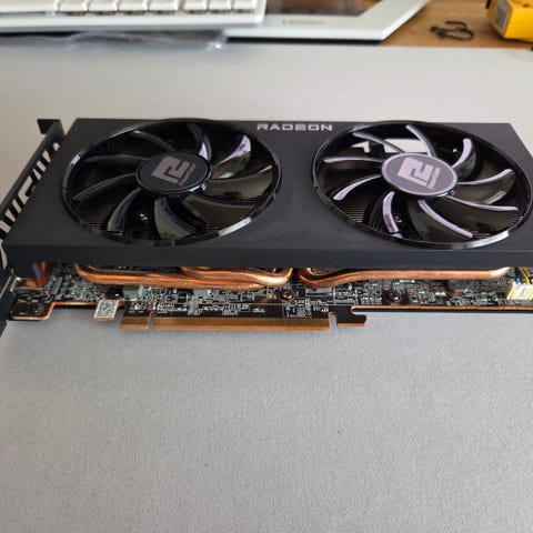 PowerColor AMD Radeon RX 7600 XT grafikkort med 16GB GDDR6 hukommelse. Kortet er udstyret med to blæsere til køling og flere video-udgange, herunder HDMI og DisplayPort. Modelbetegnelsen på kortet er RX7600XT 16G-F.