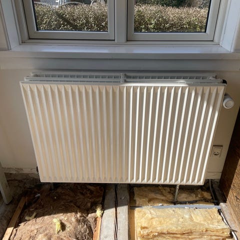 Radiator med termostatventil i hvid. Traditionel radiator til vandbåret varmesystem. Radiatoren er udstyret med hvid termostatisk reguleringsventil i bunden, til justering af rumtemperaturen. Egnet til brug i bolig, fx stue, værelse eller køkken, hvor der er eksisterende rørinstallation til centralvarme eller fjernvarme.