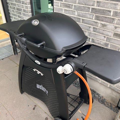 Weber Q 3200 gasgrill i sort. Grillen har låg med indbygget termometer og grillrist i støbejern, disse er forholdsvis nye, da vi har udskiftet dem for et års tid siden. Modellen står på vogn med hjul og har sideborde på begge sider. Velegnet til udendørs madlavning i have eller på terrasse med gasflaske som brændsel.