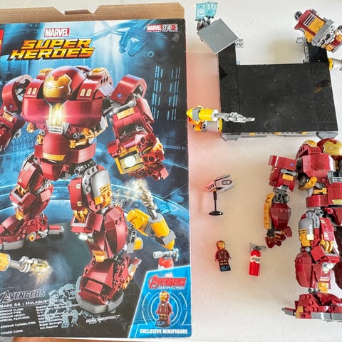 LEGO Marvel‑lot — 7 figurer, 4 sæt (bygget) — manualer medfølger