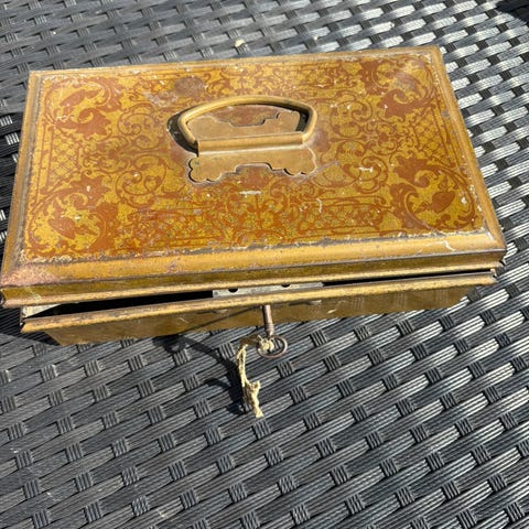 Rå og rustik pengekasse indsats, som er perfekt til både mønter og sedler. Overfladen fremstår rå og industrielt præget. Der er brugsspor i form af rust. Den midterste indsats kan fjernes, hvis det ønskes.