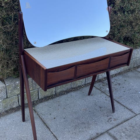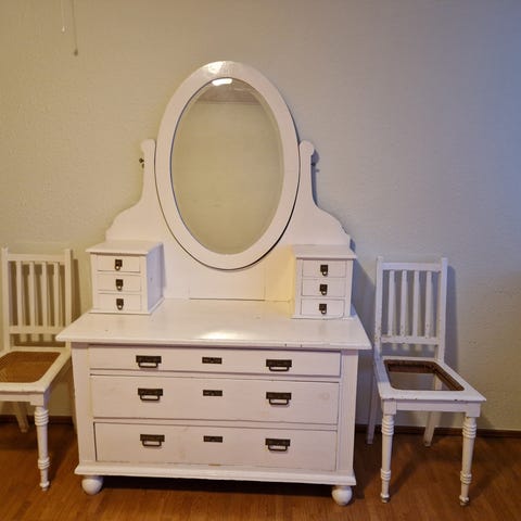 Marie Antoinette toiletbord med 3-fløjet spejl. Toiletbordet er i nyreformet fyrretræ beklædt med stof på bordplade bag og på siderne. Der er voile monteret på front. Glasplade til toppen med lille afslag i kant, men ikke alvorligt.
