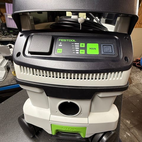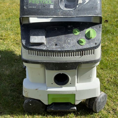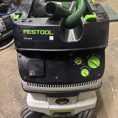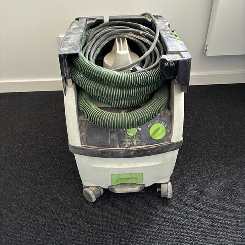 Festool CTM 26 E støvsuger til professionel og industriel brug. Støvsugeren er monteret på hjul for nem transport og har integreret opbevaring til ledning og slange. På betjeningspanelet findes drejeknapper til regulering af sugestyrke samt til- og frakobling.