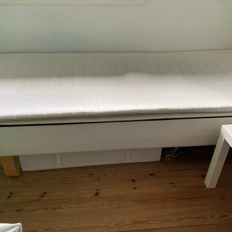 Jysk madras i hvidt betræk. Madrassen har en højde på ca. 10 cm, målt fra siden. Overfladen er quiltet med synlige stikninger. Velegnet til brug i seng, gæsteseng eller som ekstra madras.. (Dreamzone)