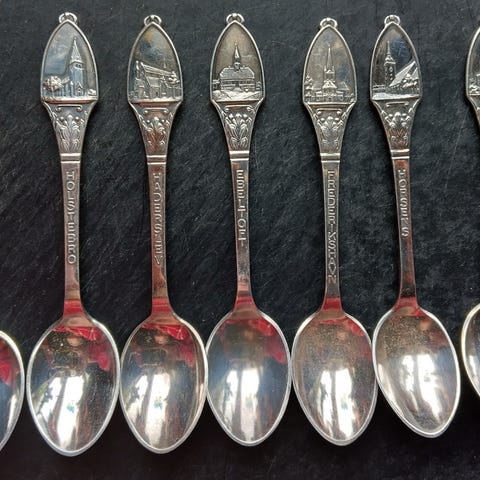 Souvenir teskeer sæt med Holland/Nederland motiver i metal. Sættet består af flere små skeer, hver med forskelligt reliefmotiv på skaftet, bl.a. skibe, kvinde i traditionel hollandsk dragt og våbenskjold med teksten "Nederland" og "Holland". Skeerne er velegnede som samlerobjekter eller pynt, f.eks. i vitrineskab eller på vægophæng til souvenirskeer.