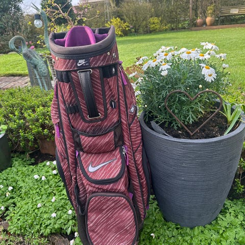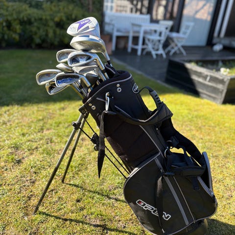 Nike golfbag i sort med skulderstropper og flere lommer. Tasken indeholder et blandet golfsæt med forskellige jern, køller og en putter, som ses på billederne. Sættet er til børn.