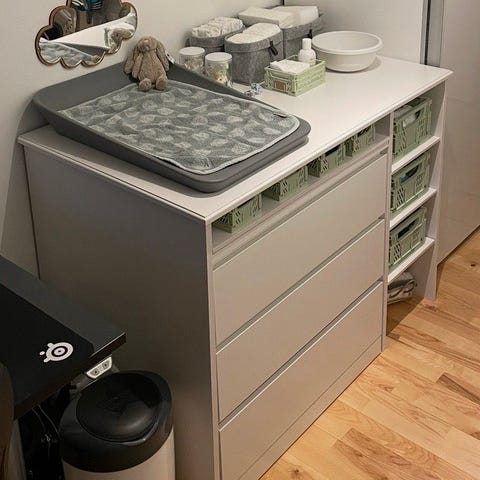 Pusledelen kan tages af så det bare er en normal kommode. Uden puslebord er den istedet 50 dyb og 90 høj