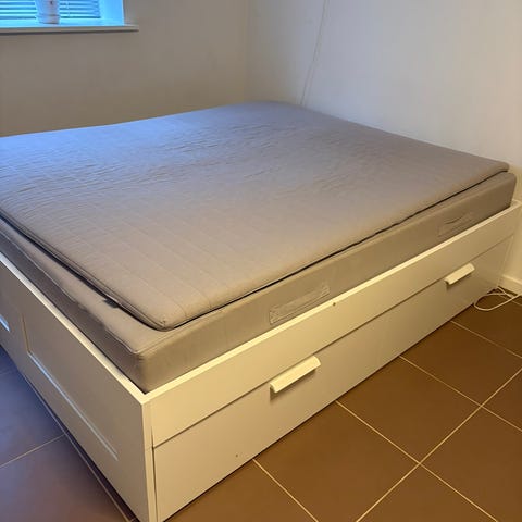 Sælger en praktisk dobbeltseng med opbevaring fra IKEA i størrelsen 160x200 cm. Sengen har god opbevaringsplads under madrassen, som nemt løftes med hydraulik.