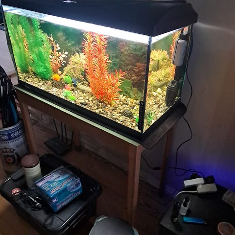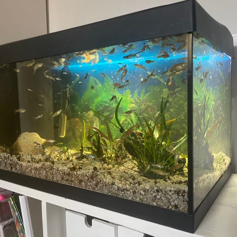 130 liters akvarie til salg med sugemaller tre forskellige arter at små fisk røde rejer og medfølger pumpe og glas låg og armatur med lysstofrør i og mosetræ i akvariet og masser af forskellige planter som gemmesteder og yngel områder til fisk og sugemaller cirka pris for nyt af er 2500kr og sælger alt hvad der er i akvariet for 1200kr har også andet fiske udstyr hvis man er interesseret i akvariet men kan aftale efter pris af hvad man ellers gerne vil have med ud over Akvariet L 78,5 cm B 39 cm D 41 cm