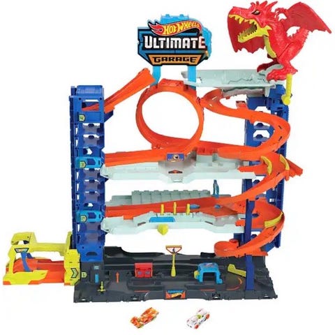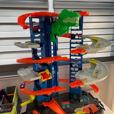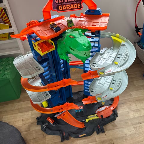 Sælger en super fed Hot Wheels bane med en grøn dinosaur, der bevæger sig og prøver at “spise” bilerne 😄