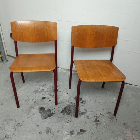 6 super fine stabelbare retrostole produceret af MH stålmøbler i 1984. Stolene har lidt finér-skader som ikke er forsøgt udbedret. Se billeder for detaljer.