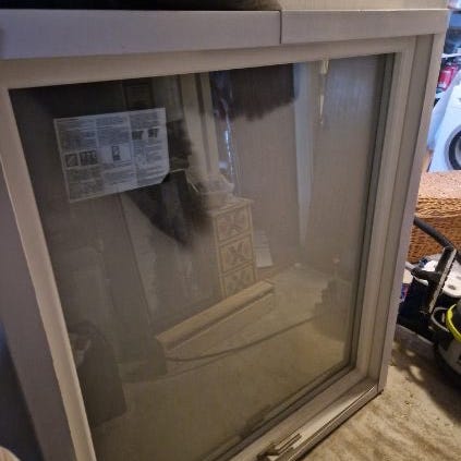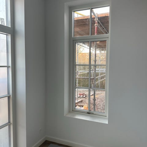 Vindue med sprosser i sort ramme. Vinduespartiet har flere felter opdelt af lodrette og vandrette sprosser. Velegnet til montering i murhul, hvor der ønskes et klassisk udtryk med opdelt glasflade. Farven er sort udvendigt, og der ses hvid karm/indfatning indvendigt på billederne. Fejl køb.
