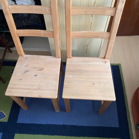 Vi sælger disse blandede træstole, som har været brugt som spisebordsstole. Stolene er i god stand, men kan godt bruges en slibning, oliering eller maling. Prisen er for alle 4 stole.