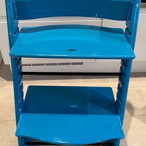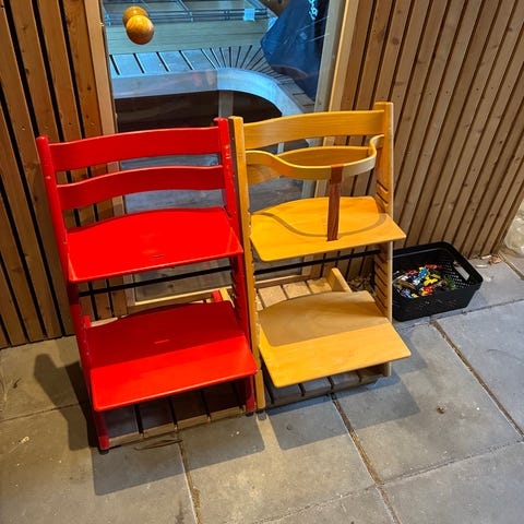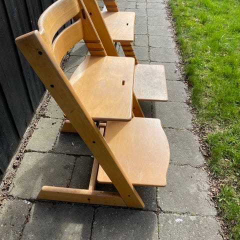Stokke højstol i grøn farve. Klassisk træhøjstol med justerbar sæde- og fodplade, der kan tilpasses barnets højde. Egnet til brug ved spisebord eller som siddestol til børn i forskellige aldre. Der er to ens stole. Hver stol sælges for 80kr.