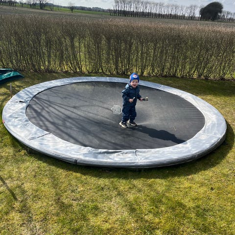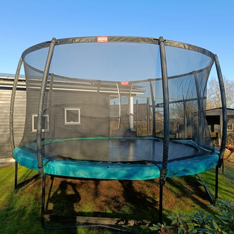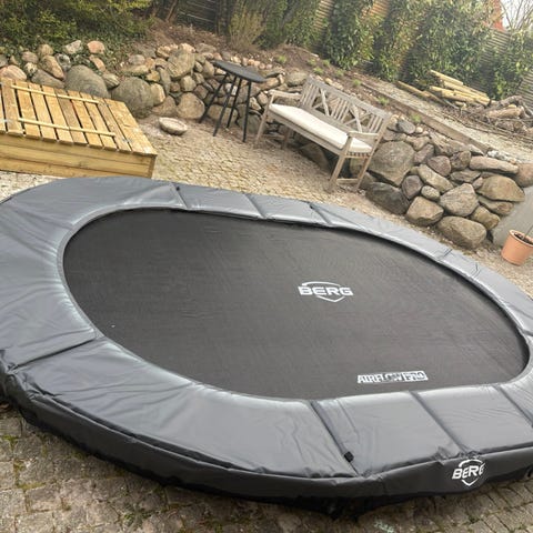 Berg trampolin Favorit 430 med spil på hoppedug købt i marts 2023 . Kvittering haves. Bolde/terninger til spil følge med. Der er sikkerhedsnet både for oven og for neden. Sikkerhedsnet for neden har praktiske lommer. Der er ingen stige. Krog til montering af fjedrer følger med. Polstring til stænger følger også med. Samleinstruks medfølger også.