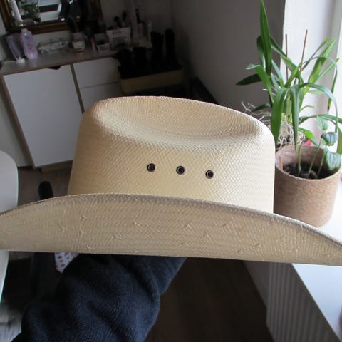 Hatten har et mønster, der minder om skæl eller reptilstruktur, samt en form, der læner sig op ad en cowboy- eller westernhat med bred skygge. Indersiden er foret med stof og mesh for øget komfort. Velegnet som accessory til hverdagsbrug eller udklædning, hvor der ønskes et markant hovedbeklædningsstykke.