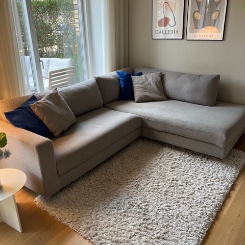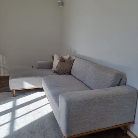 Sofaen er i brugt stand. Vi har hund, så der kan forekomme hundehår i stoffet. Derudover er der skade på stoffet under sofaen (fra hunden), men det er ikke synligt i normal brug.