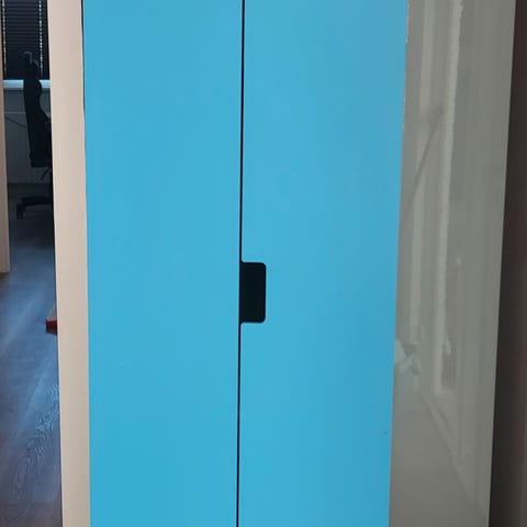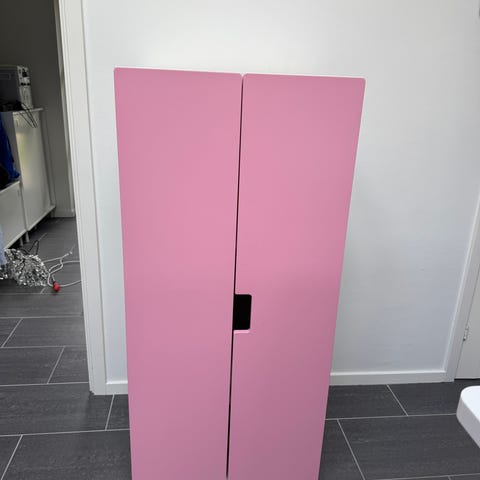 IKEA garderobeskab med hylder og skuffer i hvid og grøn. Skabet har to låger øverst og tre skuffer nederst. Indvendigt er der fire justerbare hylder, som giver god mulighed for opbevaring af tøj, legetøj eller andre ting på børneværelset eller i entreen. Overfladen er i hvid laminat med grøn front på skufferne.