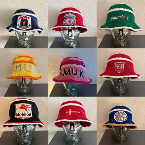 Hæklet Underberg bøllehat efter egen opskrift og design. Fast pris kr. 300.