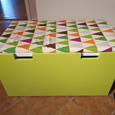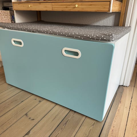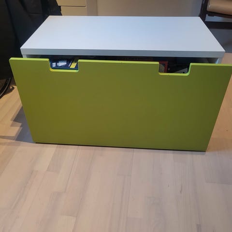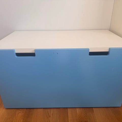 IKEA legetøjskasse i hvid med hjul på skuffe. Kassen har udskårne greb for nem åbning og lukning. Velegnet til opbevaring af legetøj eller andre børneting på børneværelset. Fremstillet i malet træbaseret materiale med glat overflade. Kan placeres fritstående på gulvet op ad væg eller i hjørne af rummet.