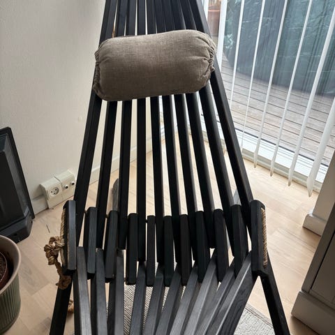 Have loungestol i teaktræ i brunlig nuance. Stolen har høj ryg med lodrette lameller, armlæn og lamel-sæde. Egnet til brug i haven, på terrasse eller altan som siddeplads ved bord eller til afslapning udendørs. Sammenklappelig.
