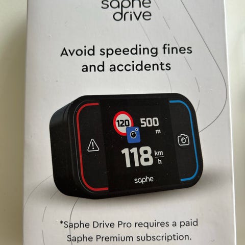 Saphe One+ trafikalarm er designet til at undgå fartbøder og ulykker. Enheden er sort og kompakt, egnet til brug i biler for at øge opmærksomheden på trafikforhold.