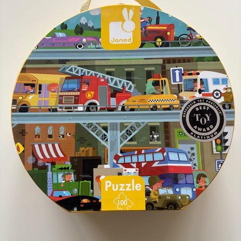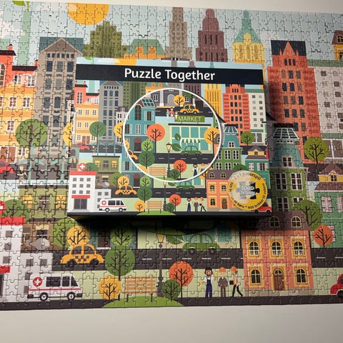Puzzle Together puslespil med bymotiv og i alt 1000 brikker. Sættet er et 2-i-1 puslespil med 100 brikker beregnet til børn og 900 brikker beregnet til voksne. Motivet viser en farverig by med bygninger, køretøjer og detaljeret byliv. Puslespillet leveres i æske med brikkerne samlet i poser.