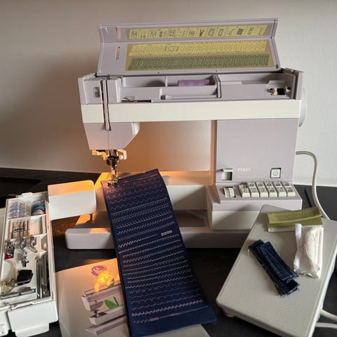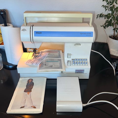 Pfaff Select 3.0 symaskine med IDT. Mekanisk symaskine med frontbetjening og indbygget tilbehørsrum. Maskinen har forskellige trykfødder, spoler og småtilbehør opbevaret i rummet foran. Der medfølger fodpedal/strømforsyning samt hårdt plastcover til opbevaring og transport. Har selv købt den brugt da min datter anvendte en tilsvarende i skolen, men har kun været anvendt et fåtal gange her i husstanden.