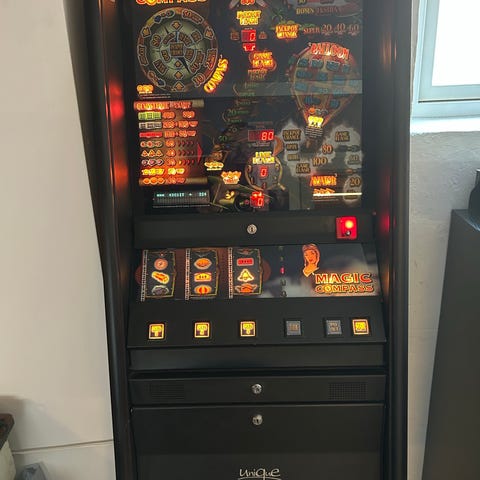 MAGIC COMPASS Maxi kabinet. Sjældent maskine til salg. Flot og velholdt maskine, er blevet serviceret jævnligt og har fået skiftet batteri som ikke sidder i printet. Er klar til brug i privat hjem.