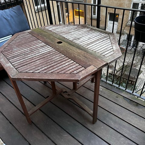 Træet er naturligt patineret/grånet af at stå ude, men er solidt og kan friskes op med olie. Både bord og stole kan klappes sammen, så det fylder minimalt.
