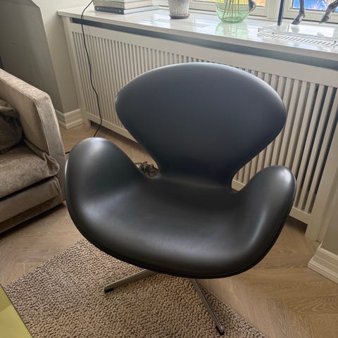 Fritz Hansen Svanen lænestol designet af Arne Jacobsen. Stolen har sort læderbetræk og drejefod i metal med fire ben. Formen er organisk med afrundede ryglæn og armlæn i ét stykke, som giver støtte til ryg og sider. Egnet som loungestol i stue, kontor eller opholdsrum.
