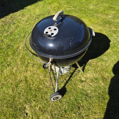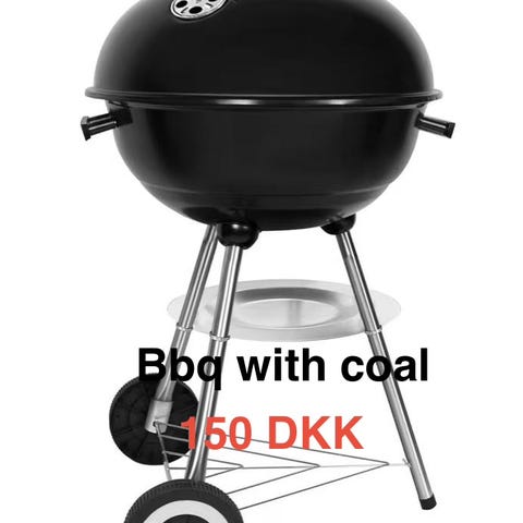 Kuglegrill i sort metal. Grillen står på ben med hjul og har låg med luftventiler. Velegnet til kulgrillning på terrasse eller i have. På billedet ses desuden en mindre bærbar kuglegrill i samme stil, som kan bruges til udflugter eller mindre grillbehov.