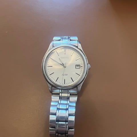 Seiko armbåndsur til unisex med sølvfarvet urskive og datoangivelse. Uret har en integreret, sølvfarvet lænke i rustfrit stål med foldelås med Seiko-logo. Analog visning med tre visere og enkle timemarkeringer. Klassisk design egnet til både hverdag og mere formelle anledninger.