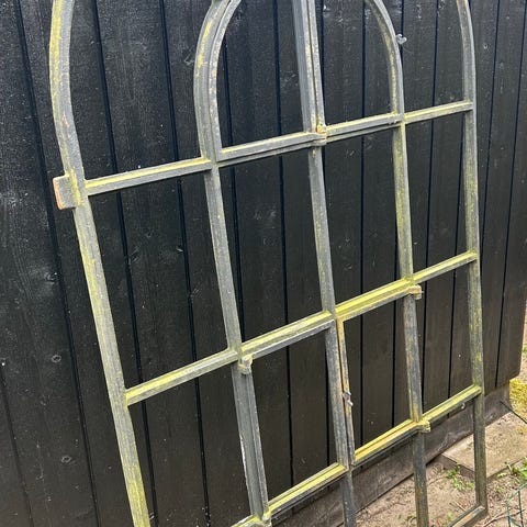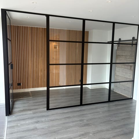 Genbrugsdøre/vinduer New York style med påmonteret skinne i sort stål.