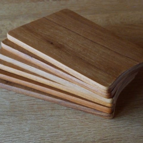 6 stks, jeg mener det er teak, men er ikke 100. de er 24 i dm