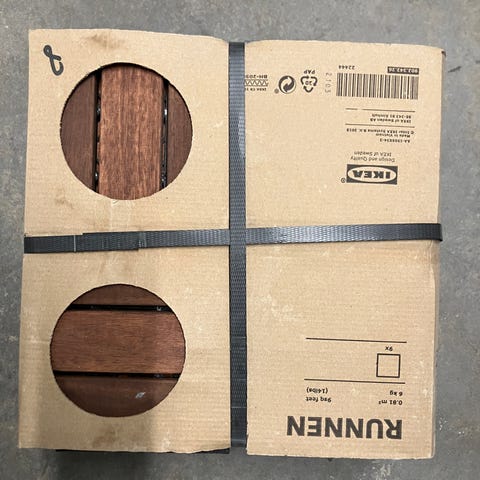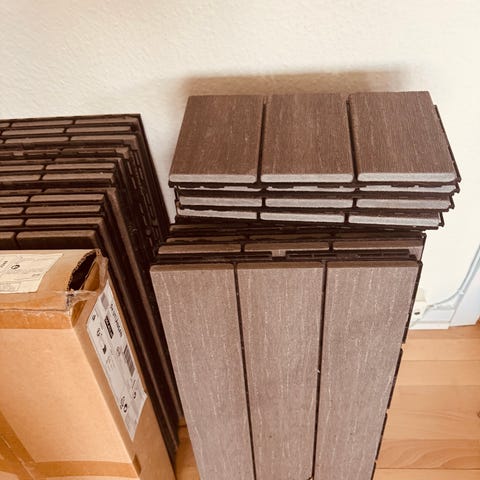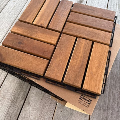 IKEA RUNNEN træfliser til gulv eller altan. Sættet dækker 0,81 m² og vejer 6 kg. Fliserne er i brun træfarve og leveres som 9 stk., der kan klikkes sammen til et sammenhængende gulv. Velegnet til brug på fx altan, terrasse eller andre plane overflader, hvor der ønskes et trægulvslignende udtryk.