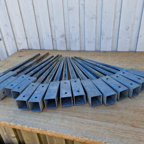 2 sæt galvaniseret stolpespyd og stolpefødder.