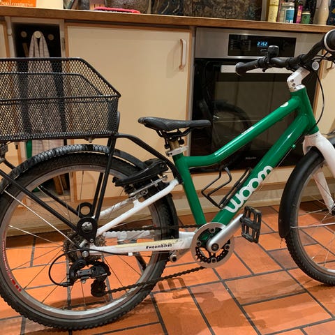 Woom børnecykel med 20" hjul i grøn og hvid. Cyklen har let stel med lav indstigning, flade styr og håndbremser for og bag. Udstyret med gear og bagsskærm. Egnet som børnecykel til ml 6-8 år nypris 4500 kun 3 pår gammel og lidt slidt men fin børnecykel i et par år